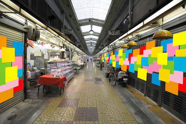 新世界にある生活の色を感じなくなってしまったグレー(シャッター)エリアに、地元の子どもたちの手でカラフルな彩りを貼り付け、積み重ねて、
